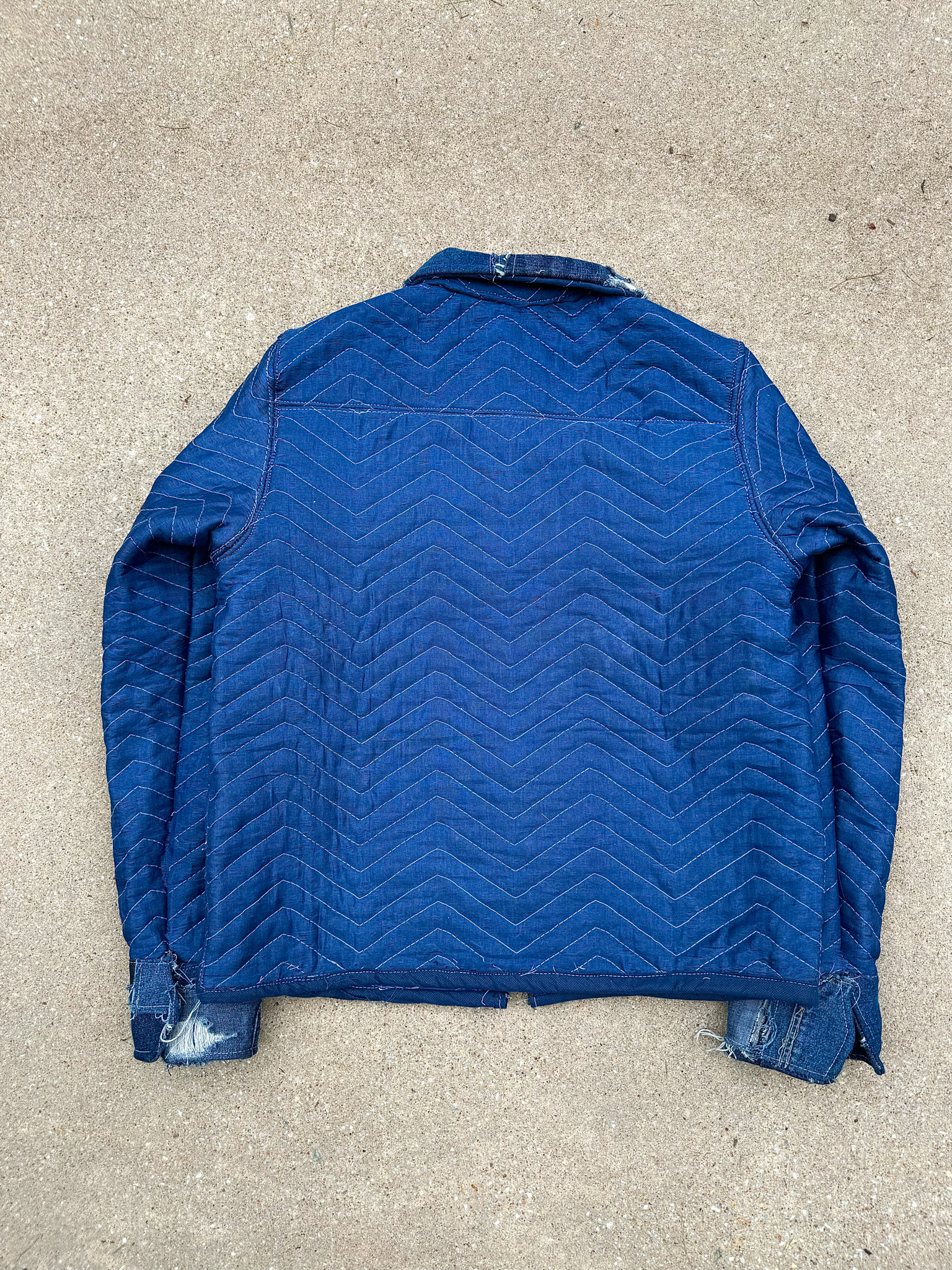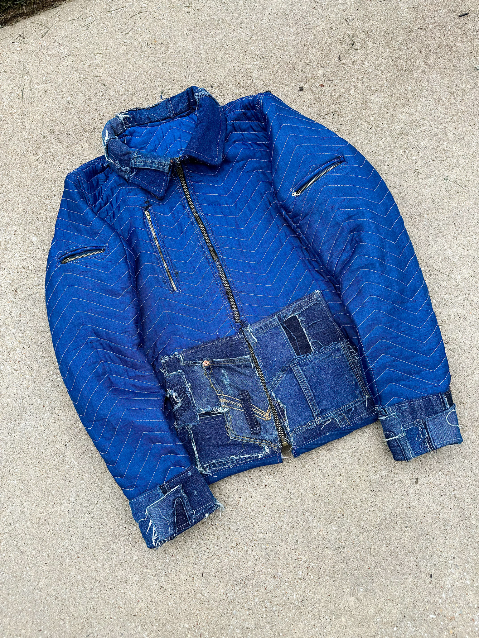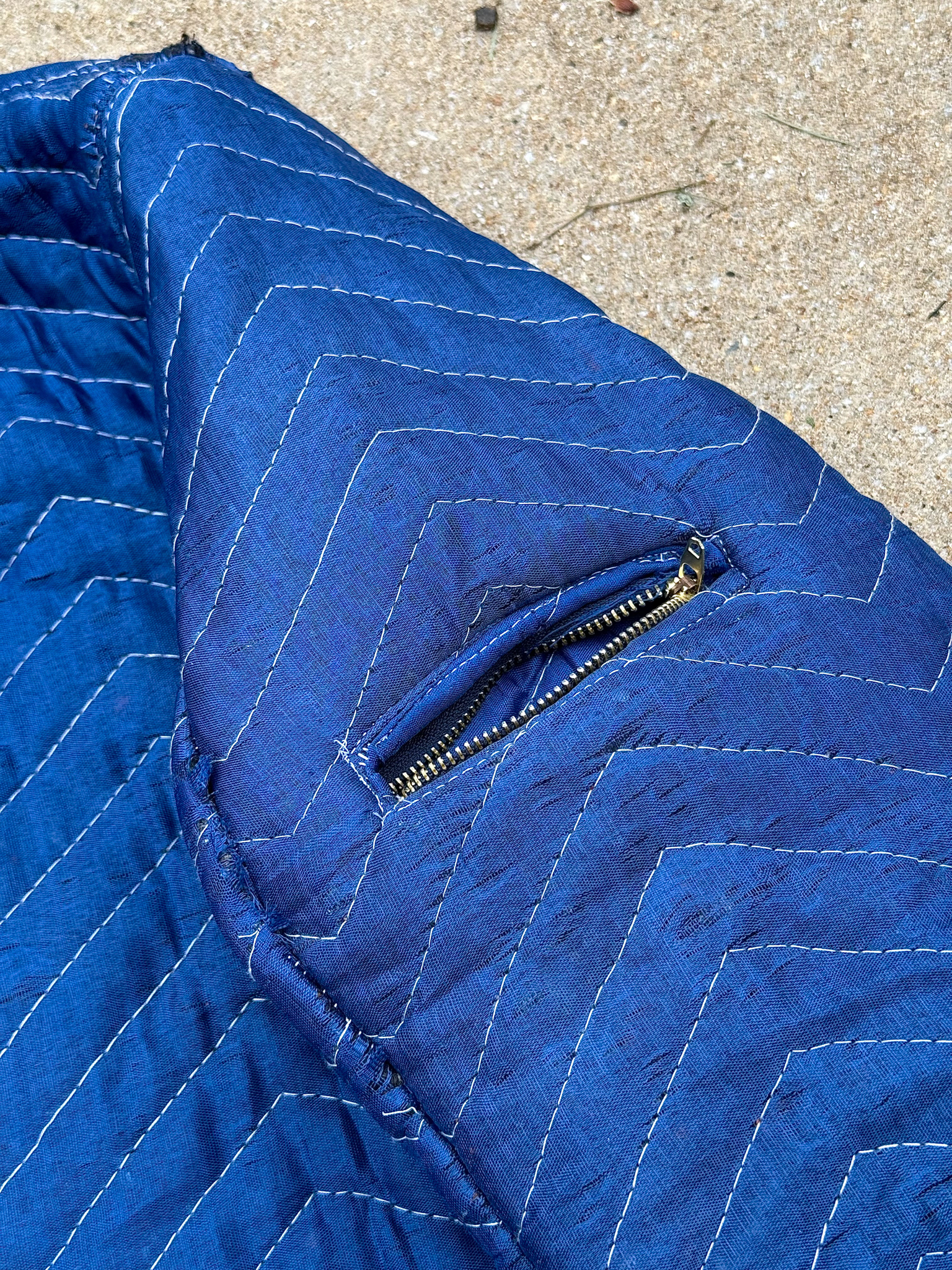 Commission project created out of moving blankets and patchwork denim scraps. Installed with antique gold hardware and five usable zipper pockets.