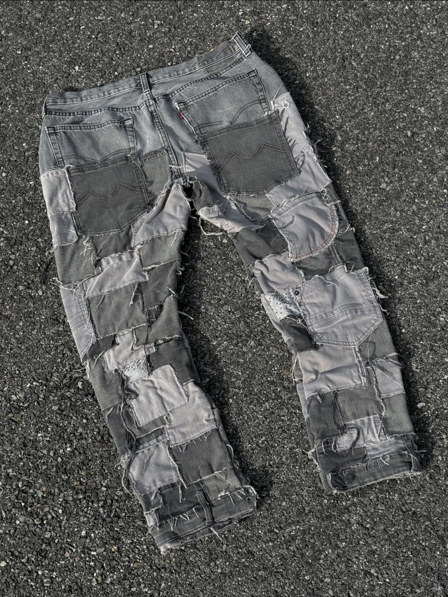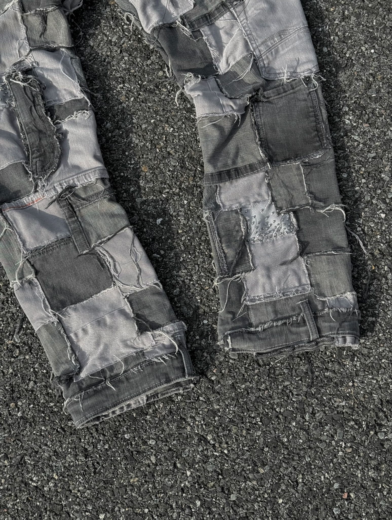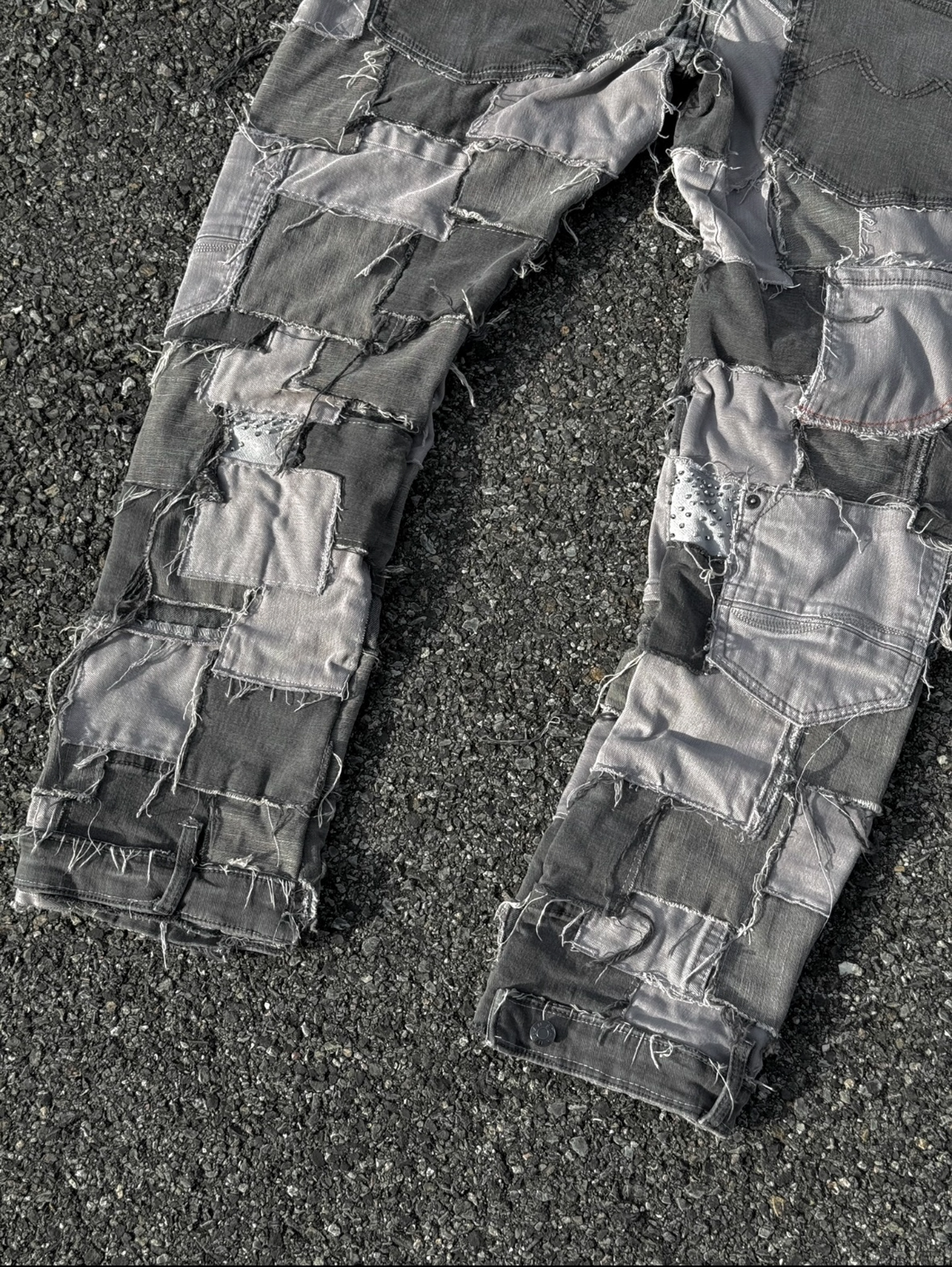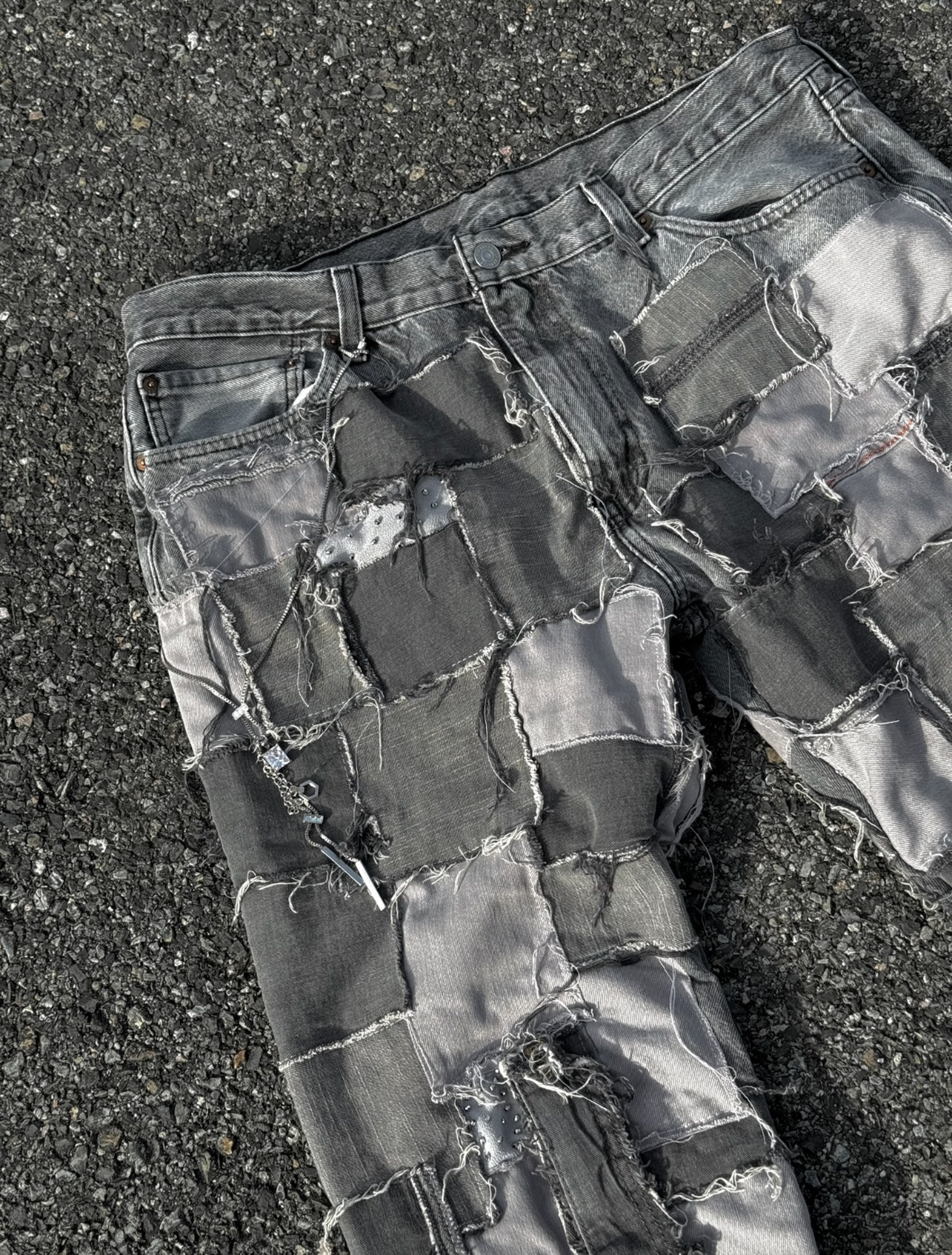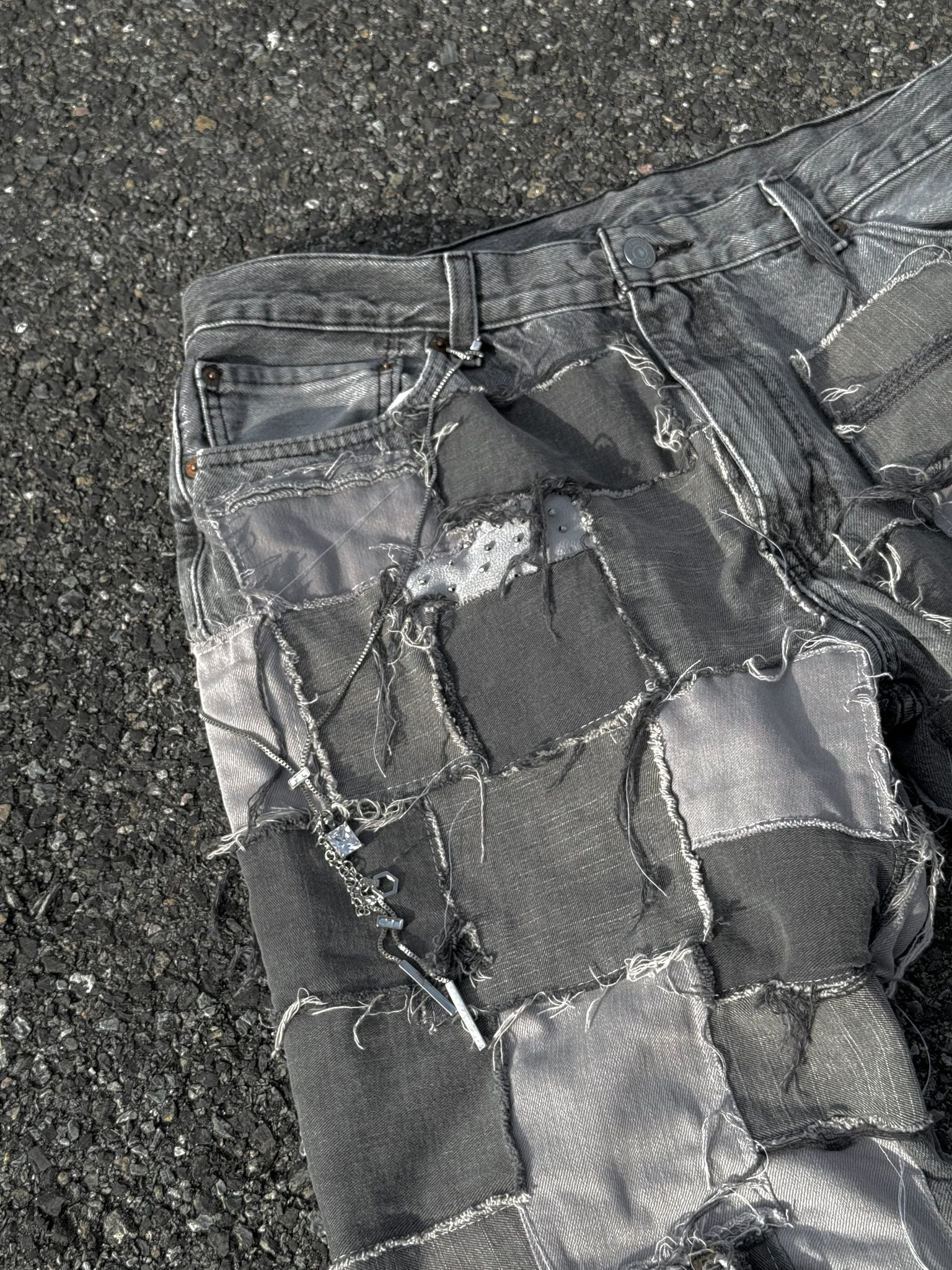 Patchwork denim created fully using secondhand jeans. Handsewn rhinestones and custom waist chain.