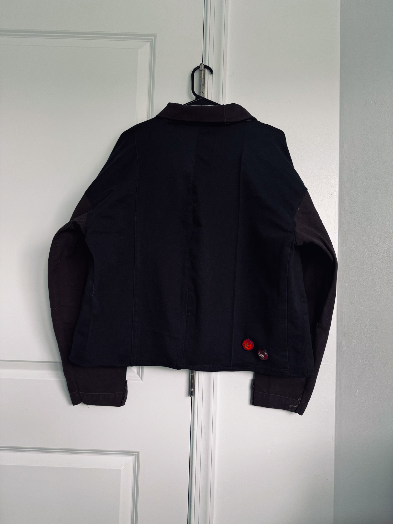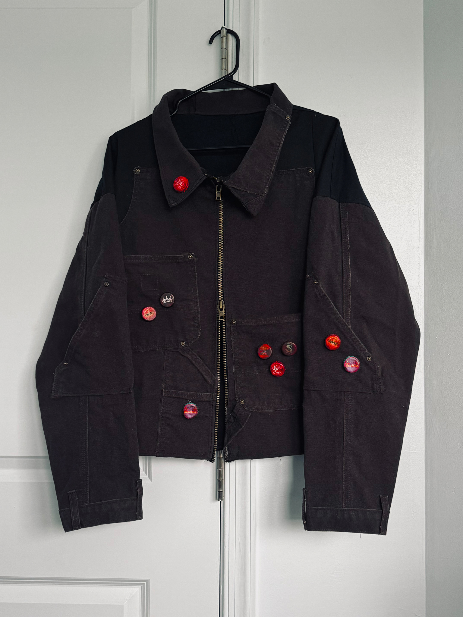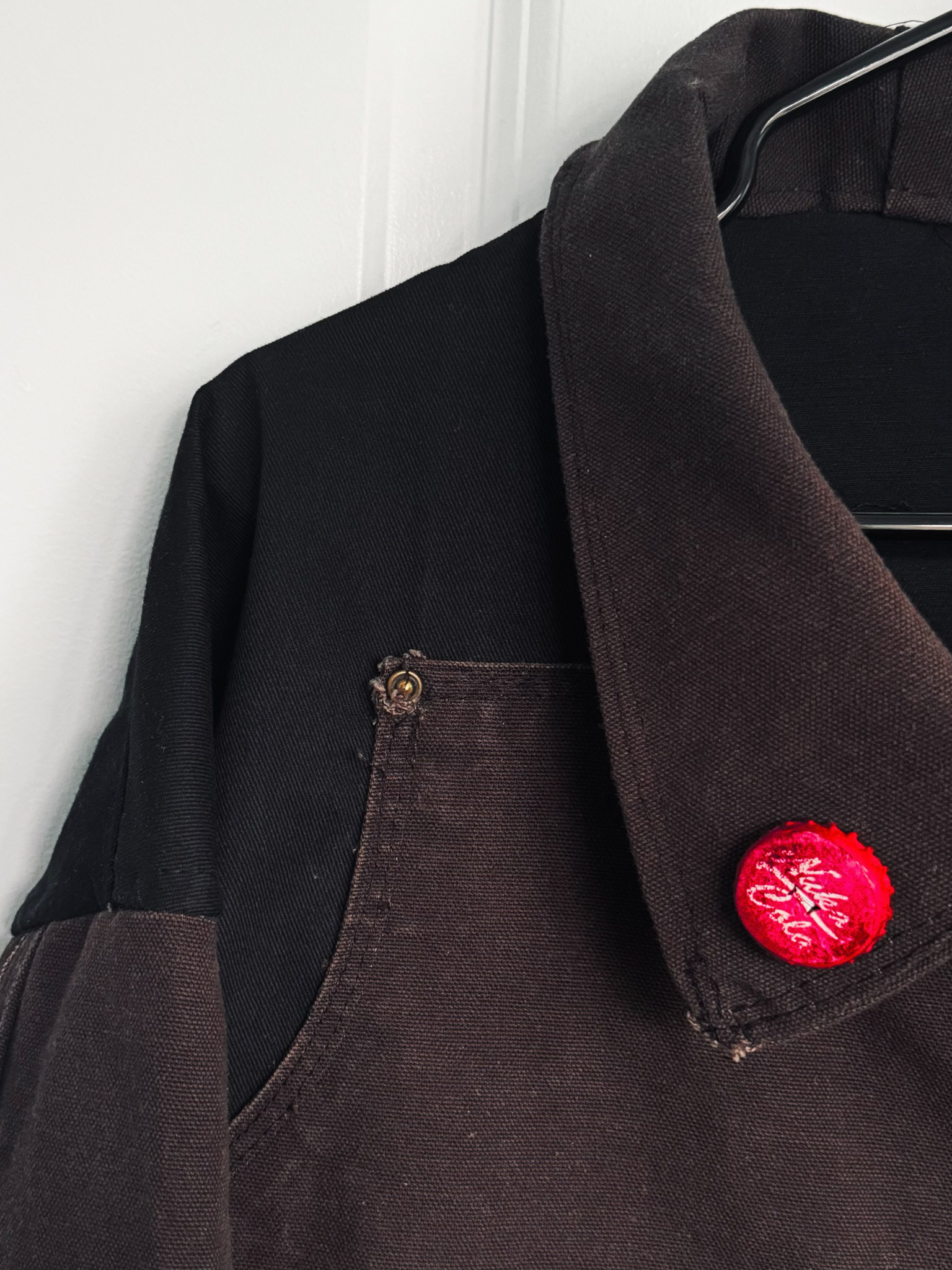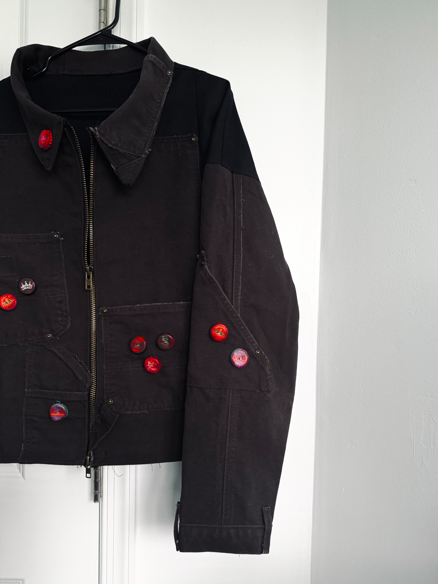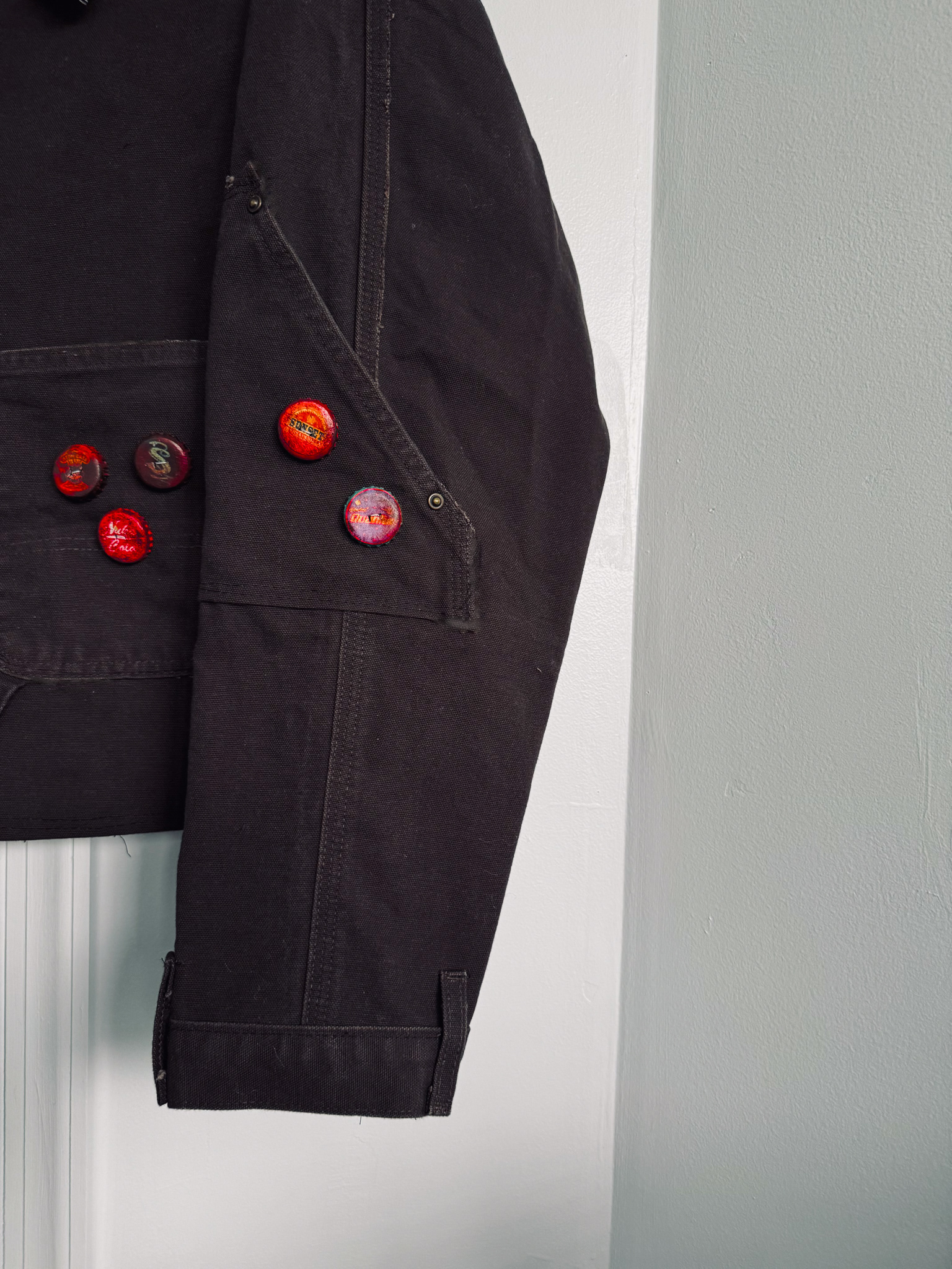 Chore Jacket created from secondhand workwear pants. Handsewn with custom made Fallout bottlecaps.